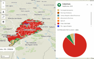 A ferramenta também permite consultar a cobertura vegetal e urbana do município. Mais de 87% da área da capital é urbanizada, com menos de 6% de cobertura florestal e cerca de 5% de formação campestre.