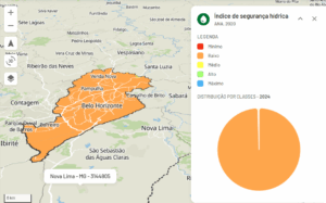 A Natureza ON também permite consultar os riscos relacionados ao abastecimento de água no município. Em quase 100% do território de Belo Horizonte, o índice de segurança hídrica é considerado baixo, de acordo com dados da Agência Nacional de Águas (ANA), o que indica grande risco de desabastecimento de água.